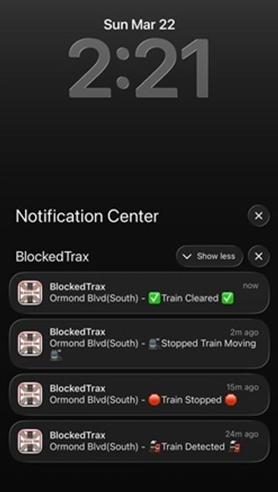 BlockedTrax keeps you informed with real-time notifications as train activity happens at monitored railroad crossings.